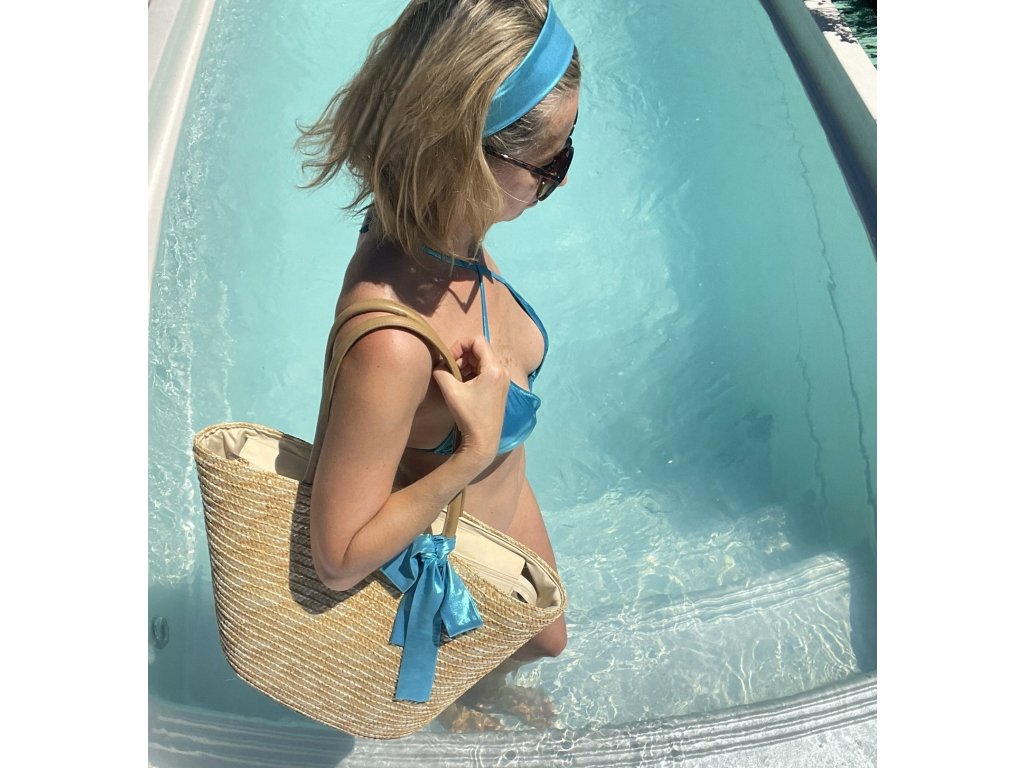 These crystal-blue two-piece bikinis with a matching accessory are crafted from custom-made, shimmering Spanish fabric, partly produced using recycled PET bottles, solar power, and zero water usage – offering UPF 50+ protection.