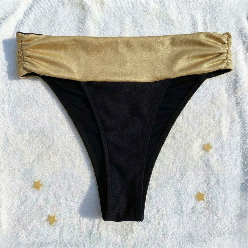 Dark Moon Sparkle*Me Brazilian bikini bottoms with a high waist that smooths the tummy, or wear them low with a shimmering golden waistband when folded down. A seam on the back accentuates your curves, paired with a high-cut leg for a flattering fit. Perfect as a second bottom to match Golden or Dark Moon Sparkle*Me bikini.